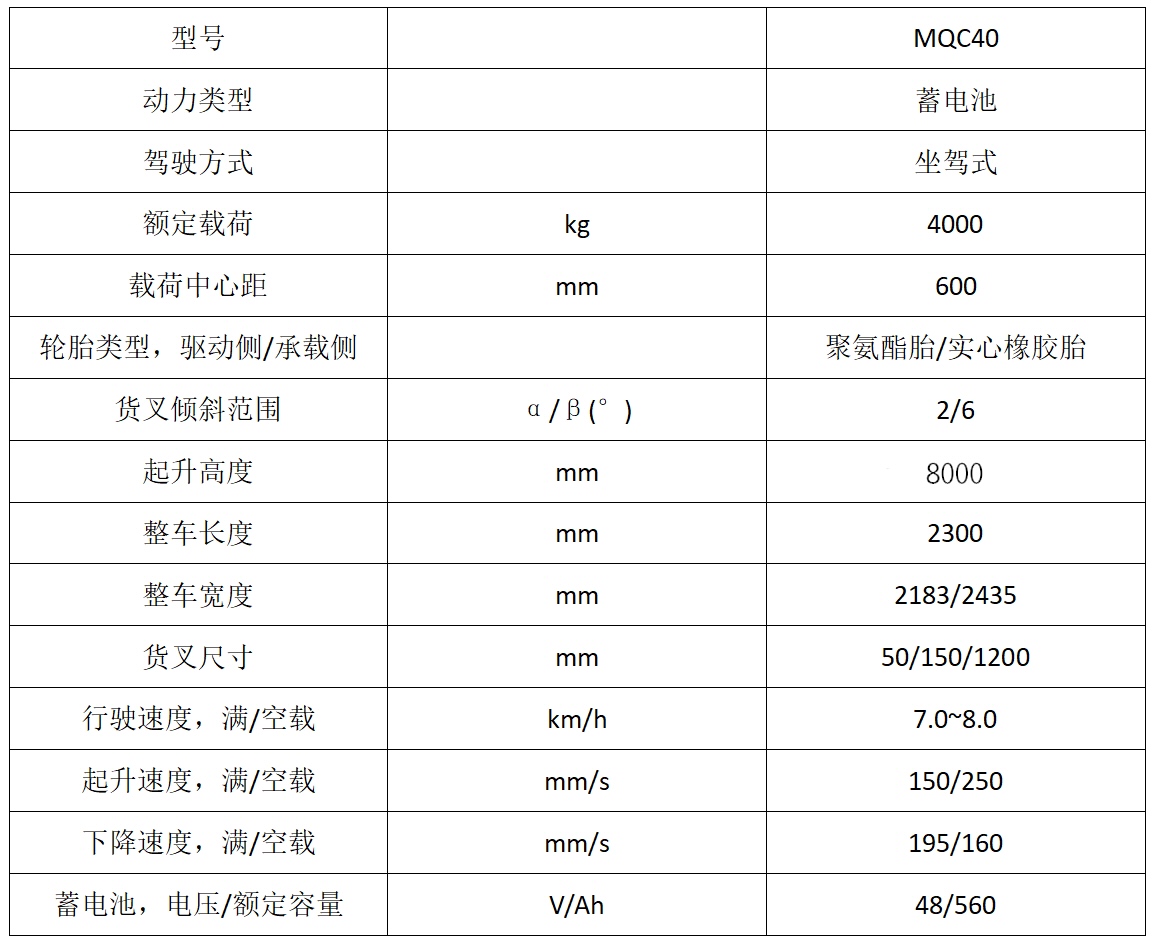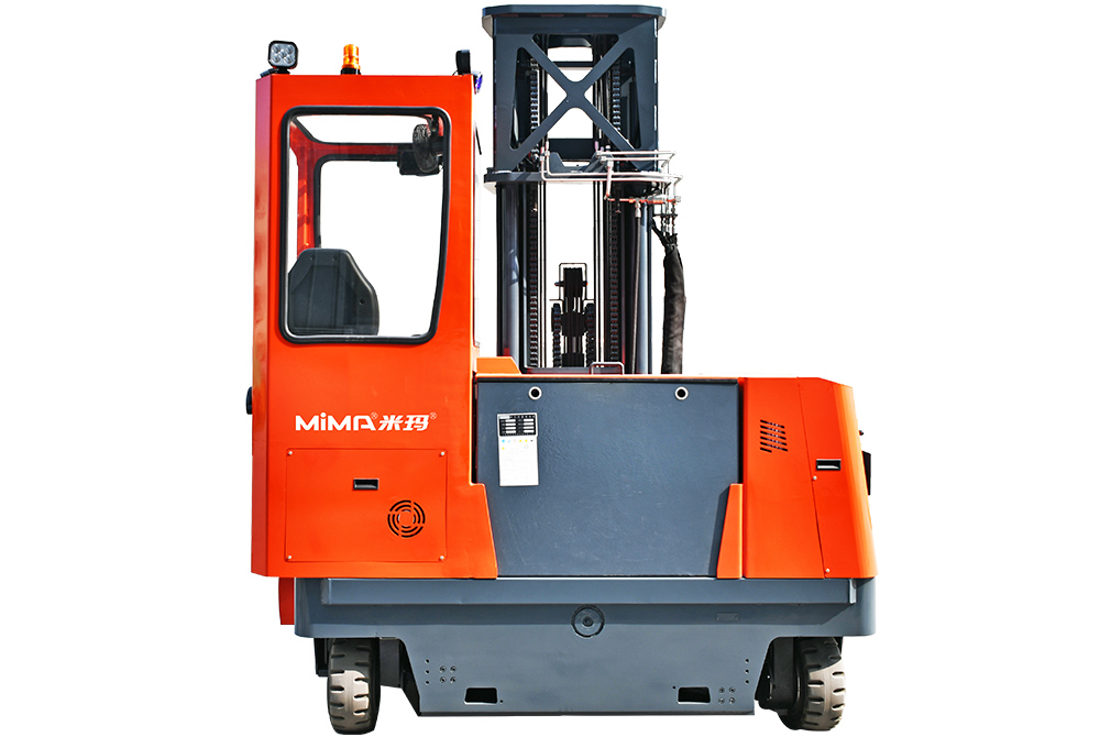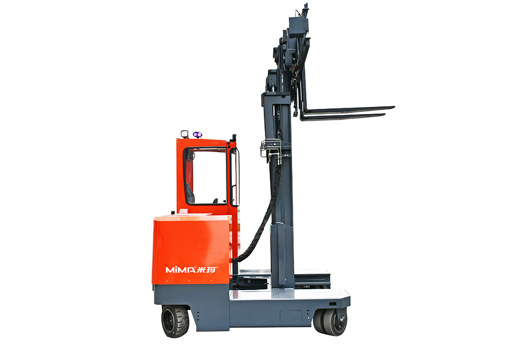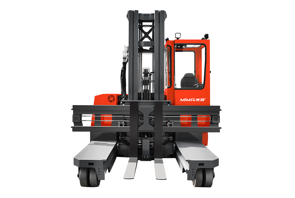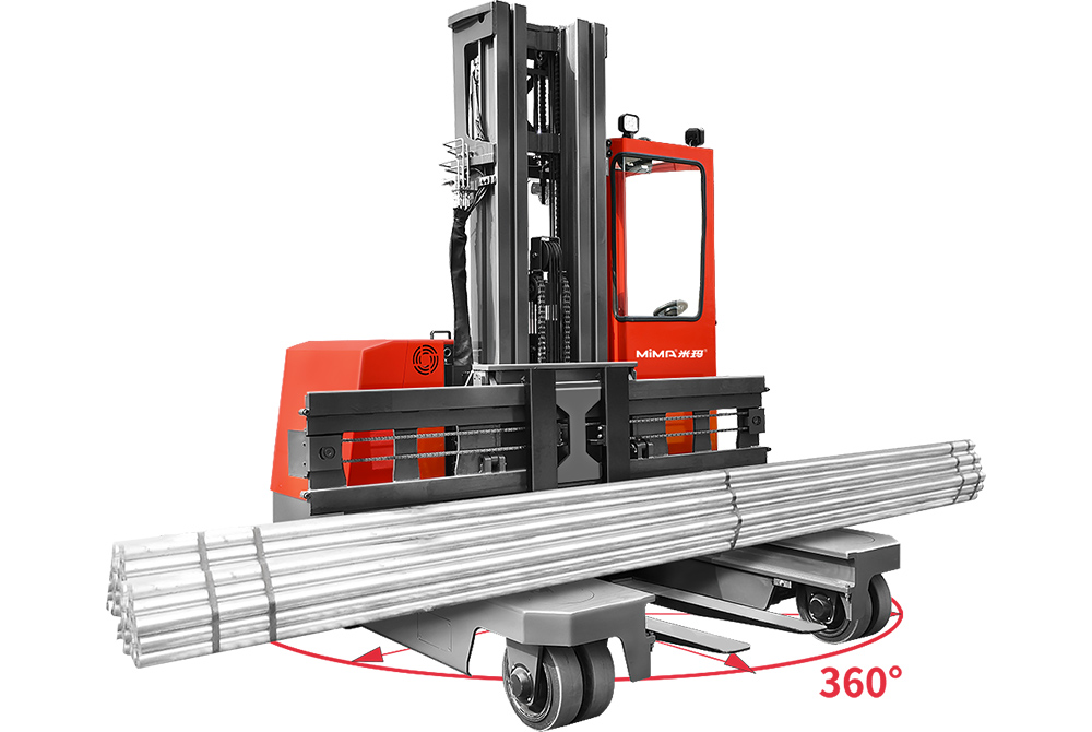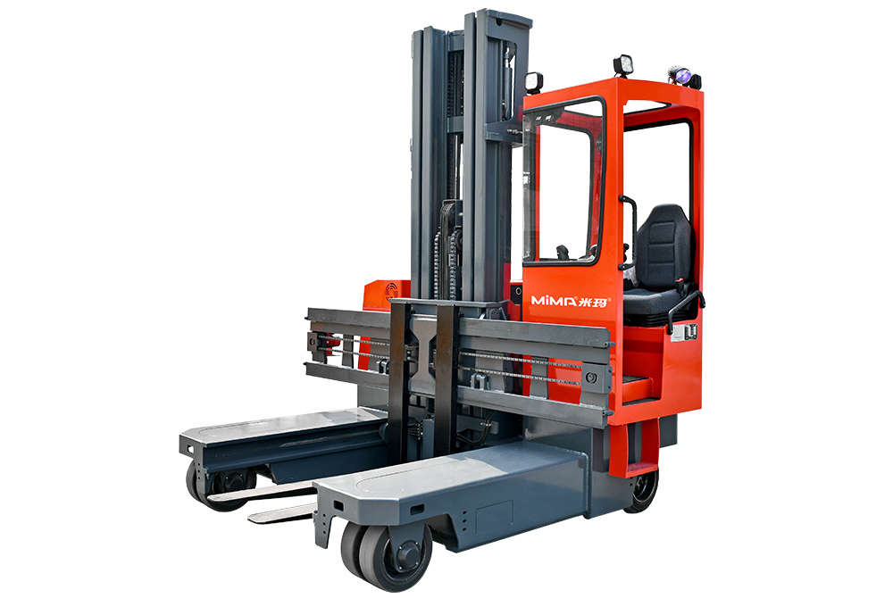 MQC40多向前移式叉車,承載能力4.0噸,門架可以整體前移或縮回,配置有加寬調(diào)距貨叉,四輪轉(zhuǎn)向獨立控制,可以直行、側(cè)行、斜行、原地回轉(zhuǎn);側(cè)行時擁有較小的通道,特別適用于長物料的工況。