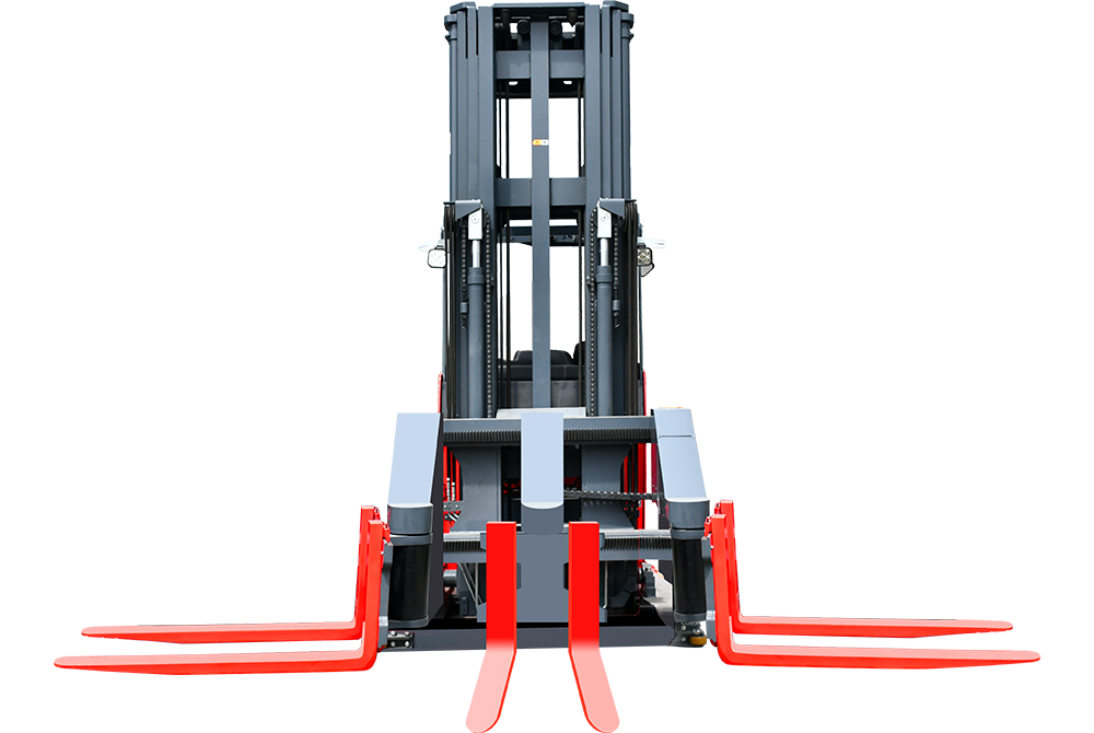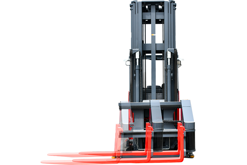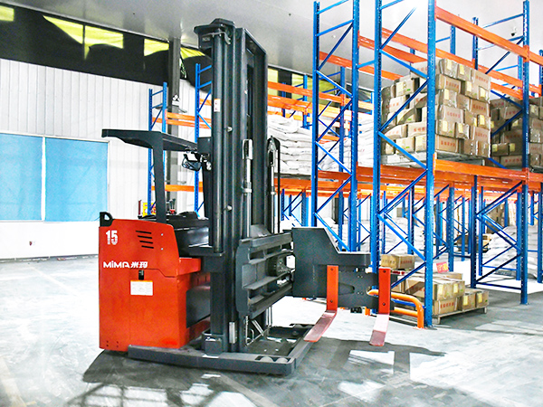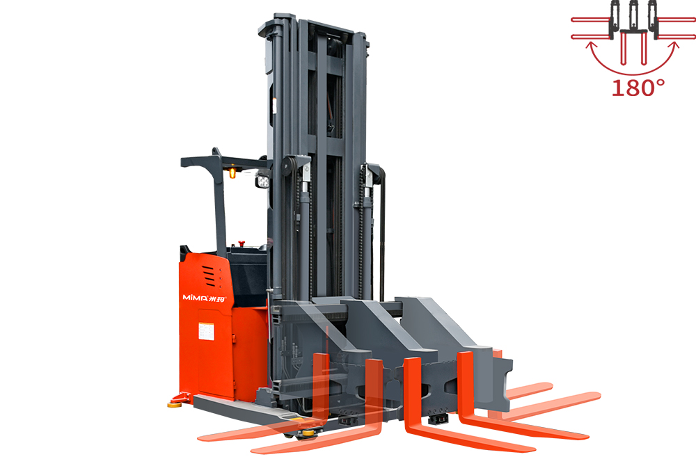 窄通道內(nèi)車身無需轉(zhuǎn)向,通過貨叉180°旋轉(zhuǎn)和左右側(cè)移來實現(xiàn)巷道兩側(cè)的貨物堆垛和裝卸。
