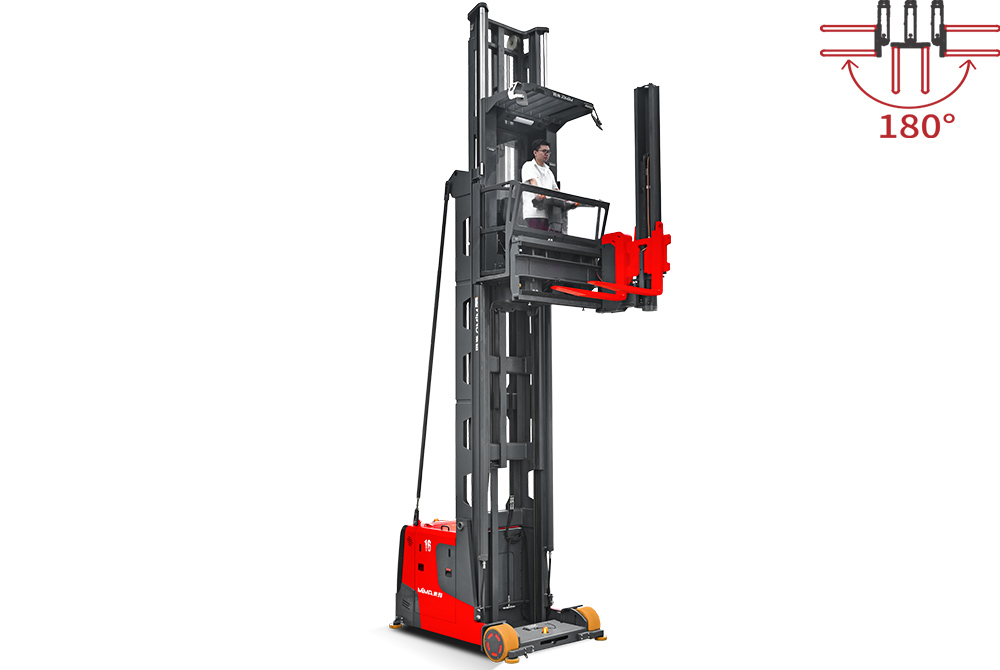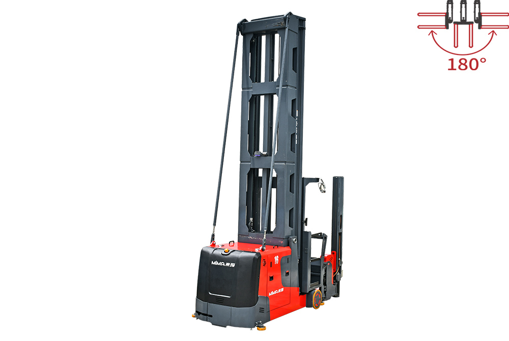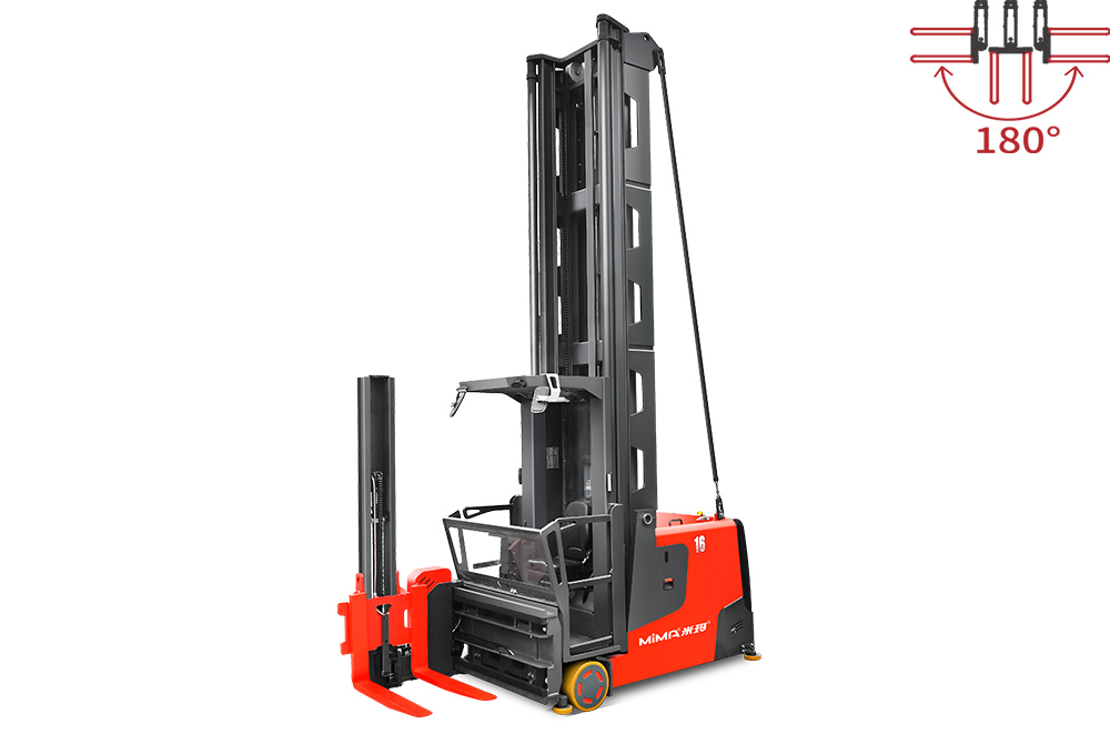窄通道內(nèi)車身無需轉(zhuǎn)向,通過貨叉180°旋轉(zhuǎn)和左右側(cè)移來實現(xiàn)巷道兩側(cè)的貨物堆垛和裝卸。