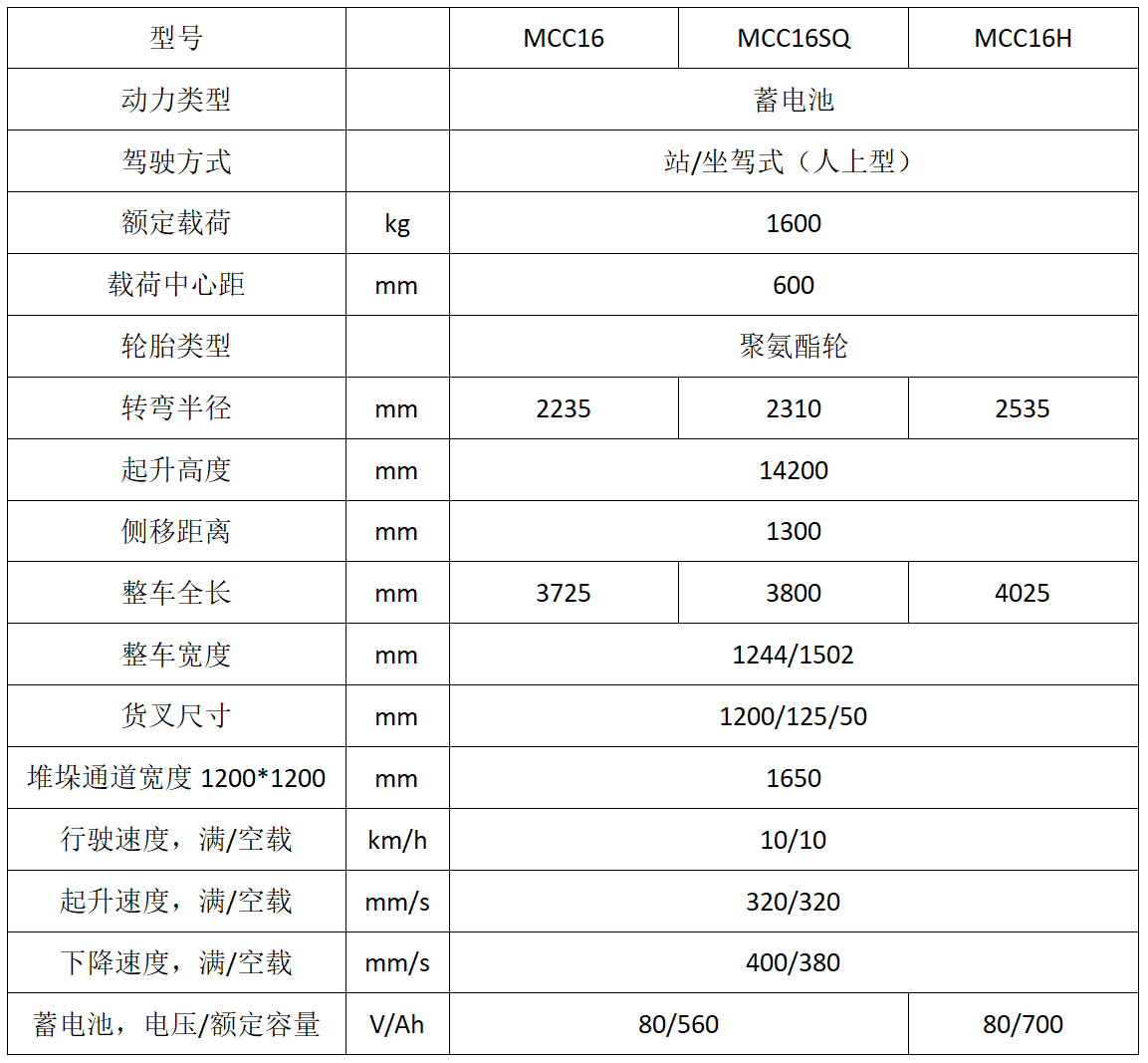 MCC16系列叉車是一款人上型窄巷道三向堆垛式叉車,額定 載荷1.6噸,主起升高度4.5‐12.5m,副起升1.7-2.5m,車身無需轉(zhuǎn)向,通過貨叉180°旋轉(zhuǎn)和左右側(cè)移來實現(xiàn)巷道兩側(cè)的貨物堆垛和裝卸。駕駛室可起升,進(jìn)行高位揀選、盤點等作 業(yè),具有站駕及坐駕兩種操作方式,具備良好的作業(yè)視野。